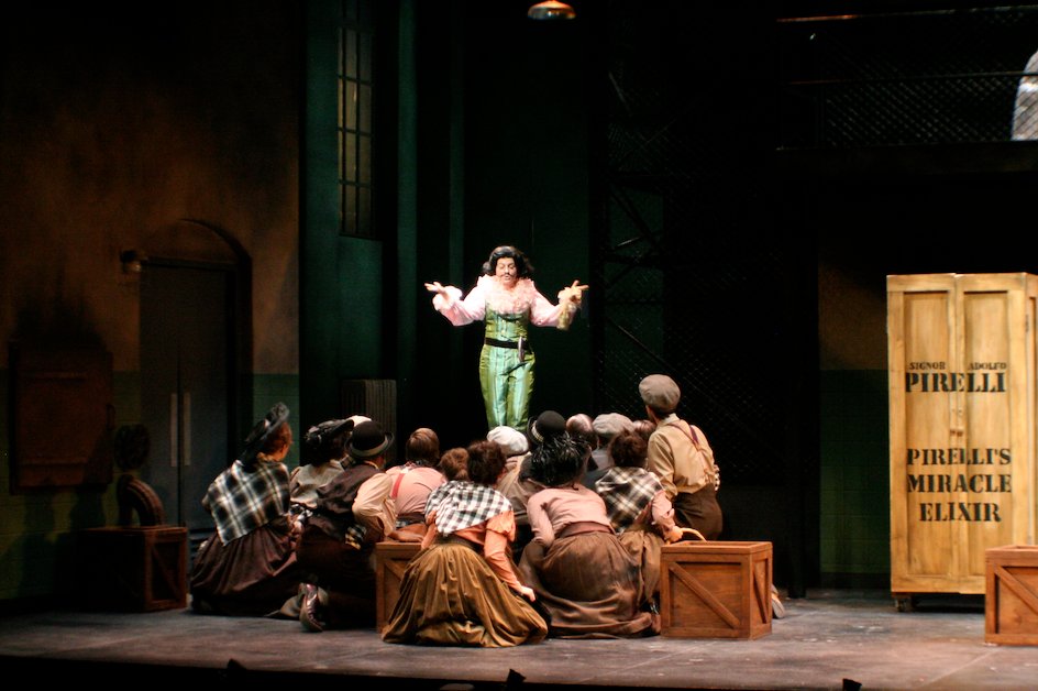Tobias (Will Skrip) hawks his master's 'Miracle Elixir'...