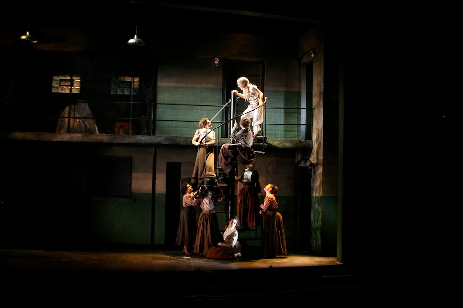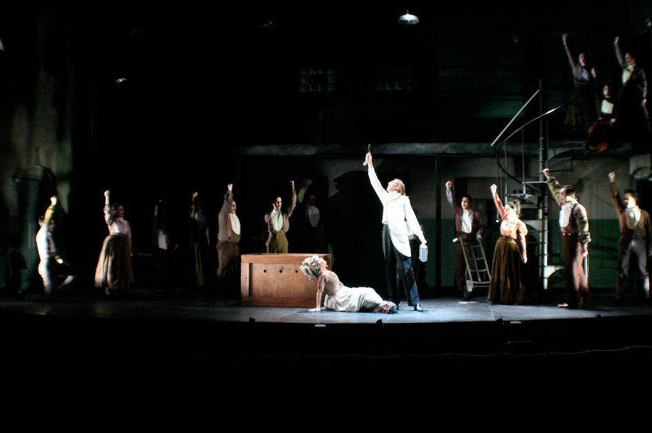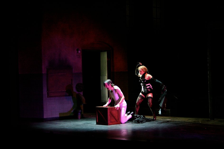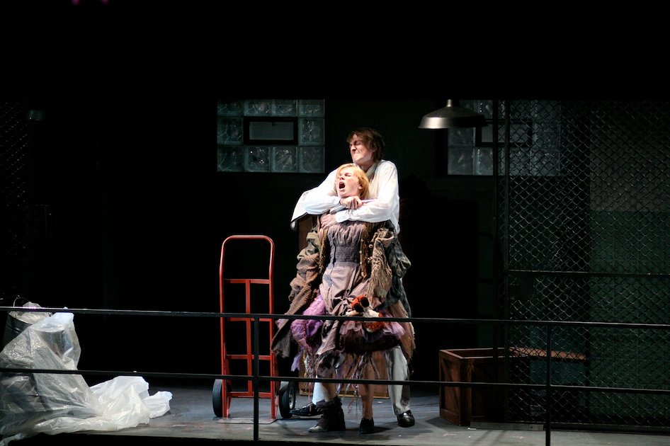 Anthony (Steve McQuown) invades Mrs. Fogg's (Katherine Docimo) Madhouse in order to rescue Johanna.