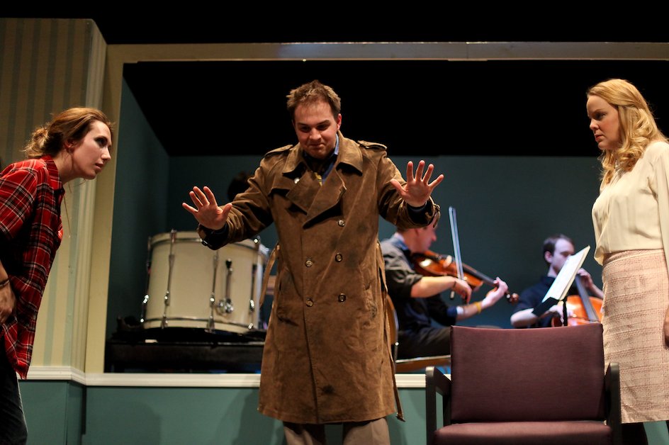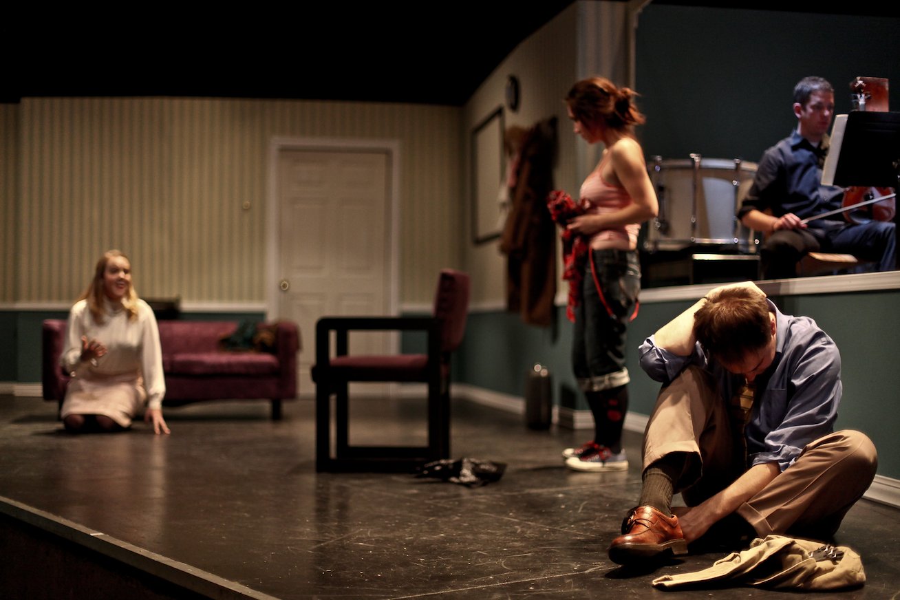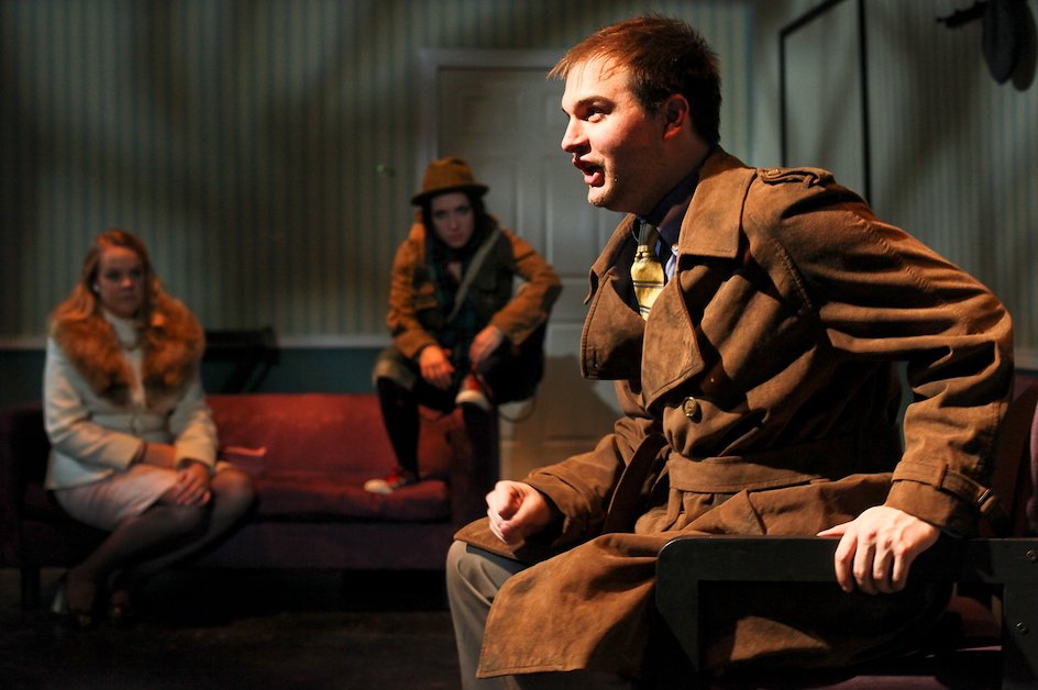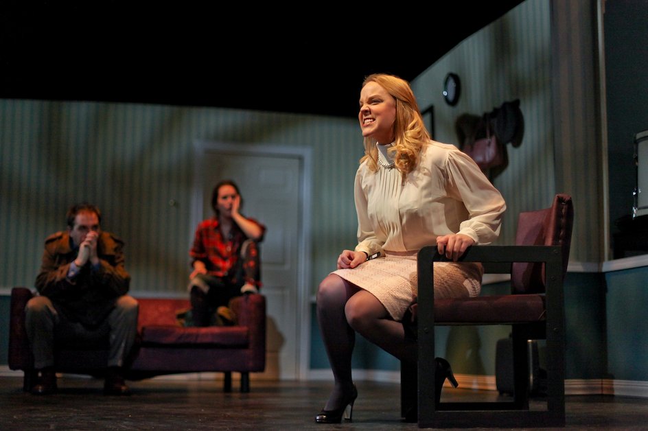 Garcin confesses to Estelle (Susan Nelson) and Inez (Caitlin McKechney) that he is in Hell for abusing his wife.