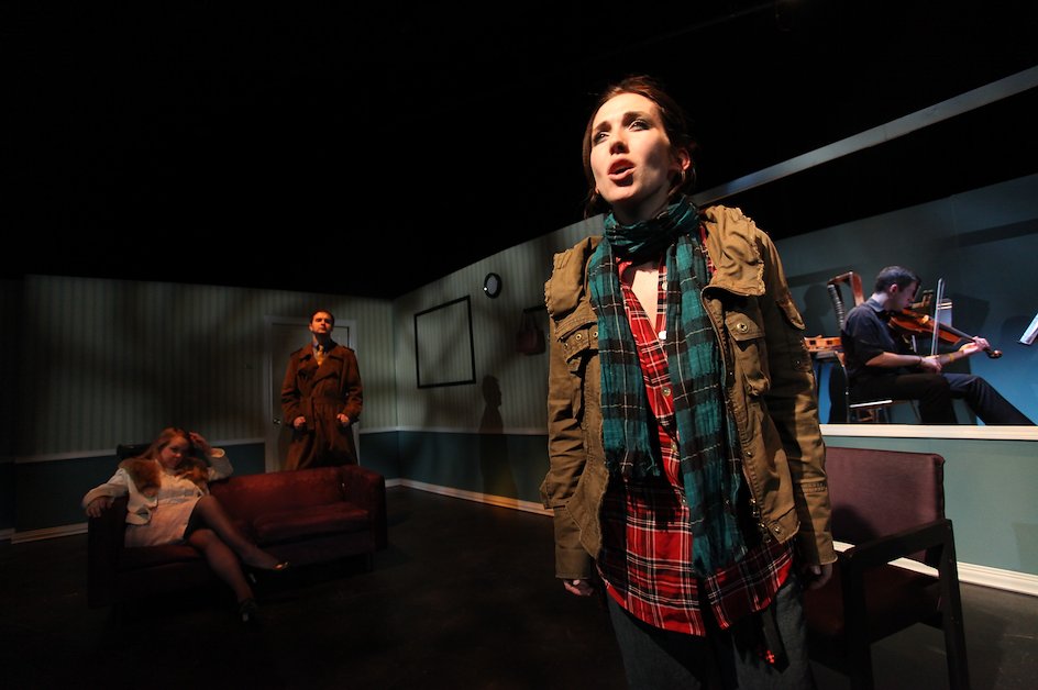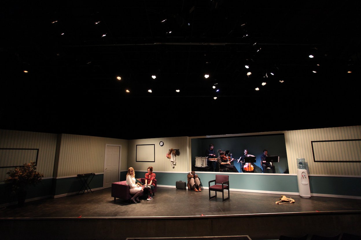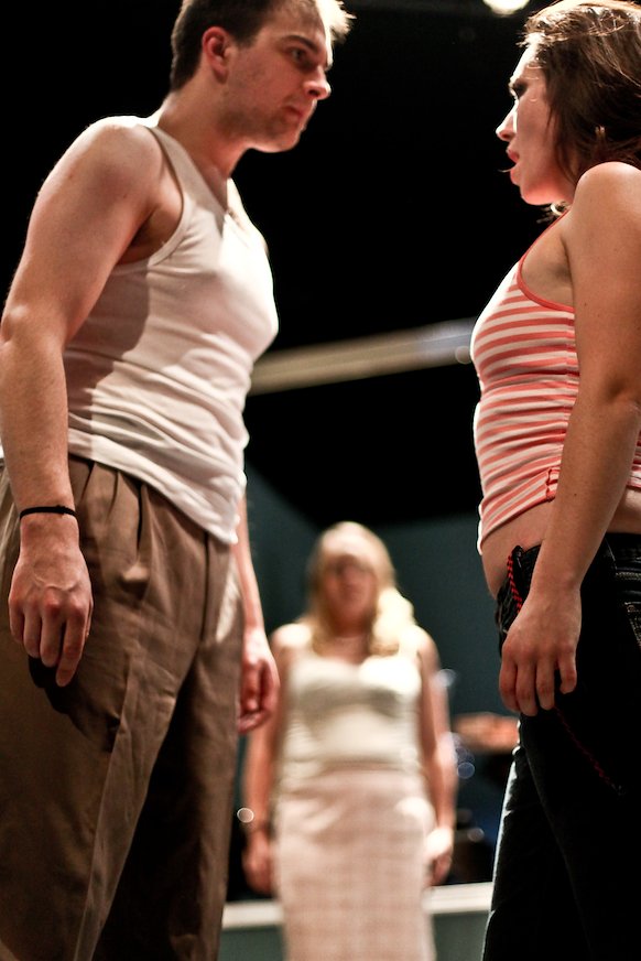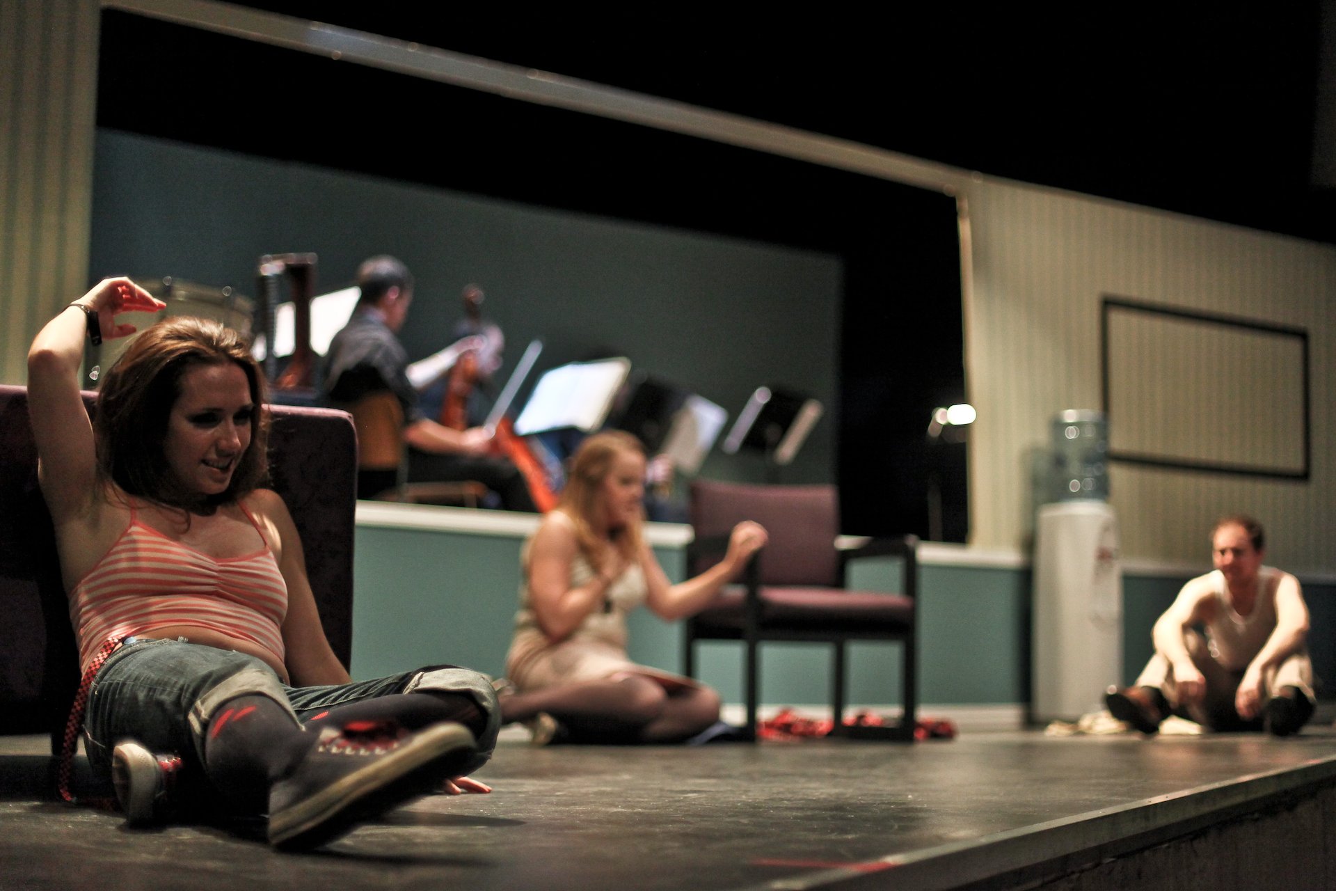 Garcin confesses to Estelle (Susan Nelson) and Inez (Caitlin McKechney) that he is in Hell for abusing his wife.