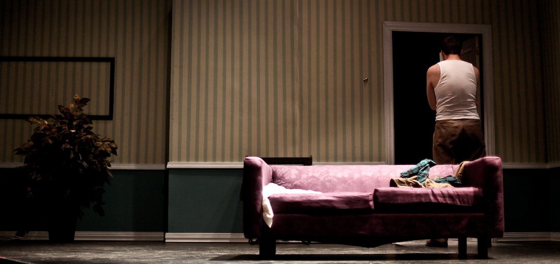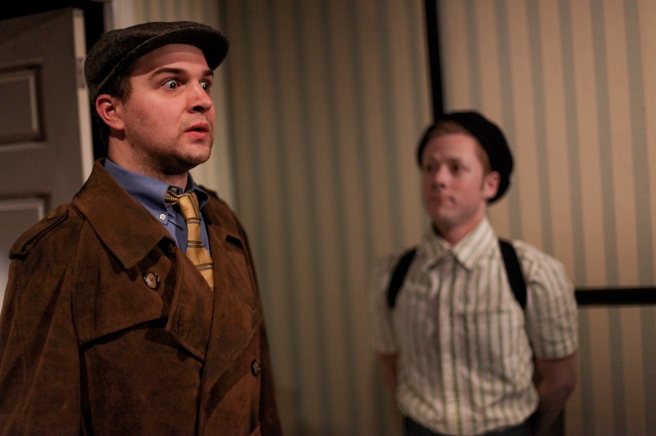 Garcin (Matthew Newlin) discovers that Hell isn't what he expected; the Valet (Peter Weathers) remains unmoved.
