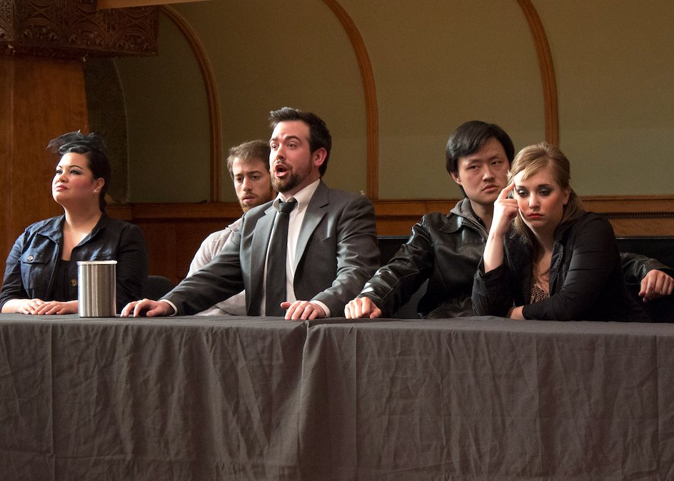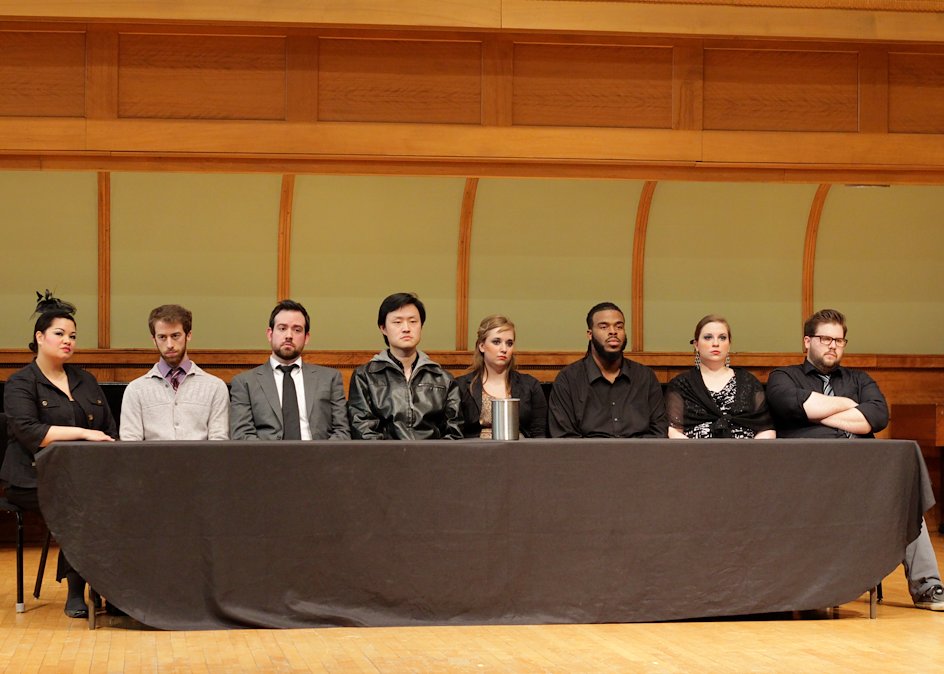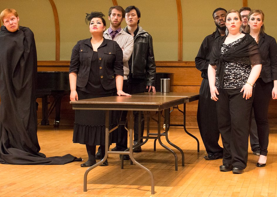 The Donati family mourn the death of their ancestor Buoso: from left to right, Zita (Gigi Urban), Simone (Gabriel Di Gennaro), Rinuccio (Drew Ladd), Marco (Yun Hao Jiang), La Ciesca (Carolyn Kocsis), Gherardo (Jordan Holland), Nella (Karen Baron) and Betto (Peter Morgan).