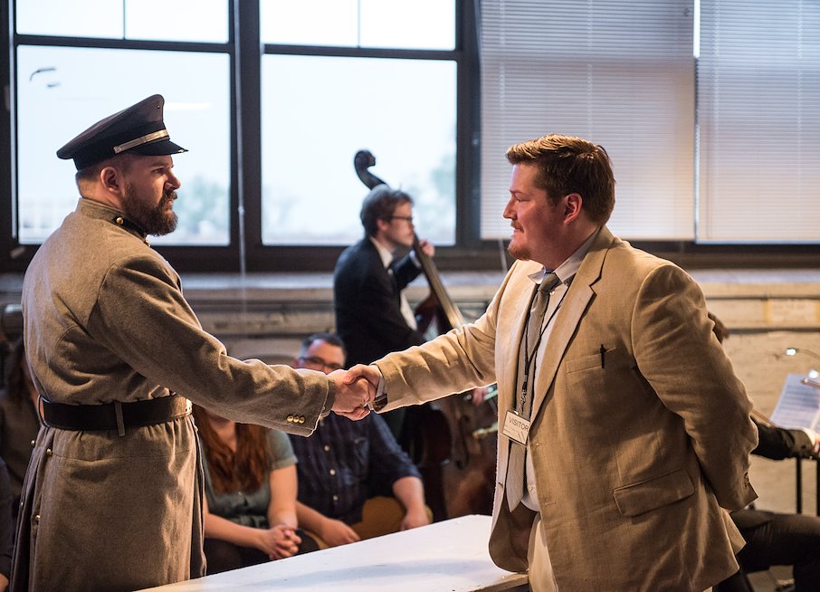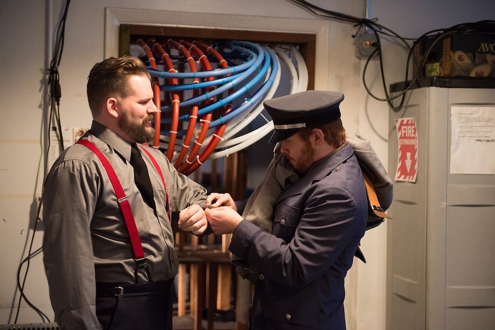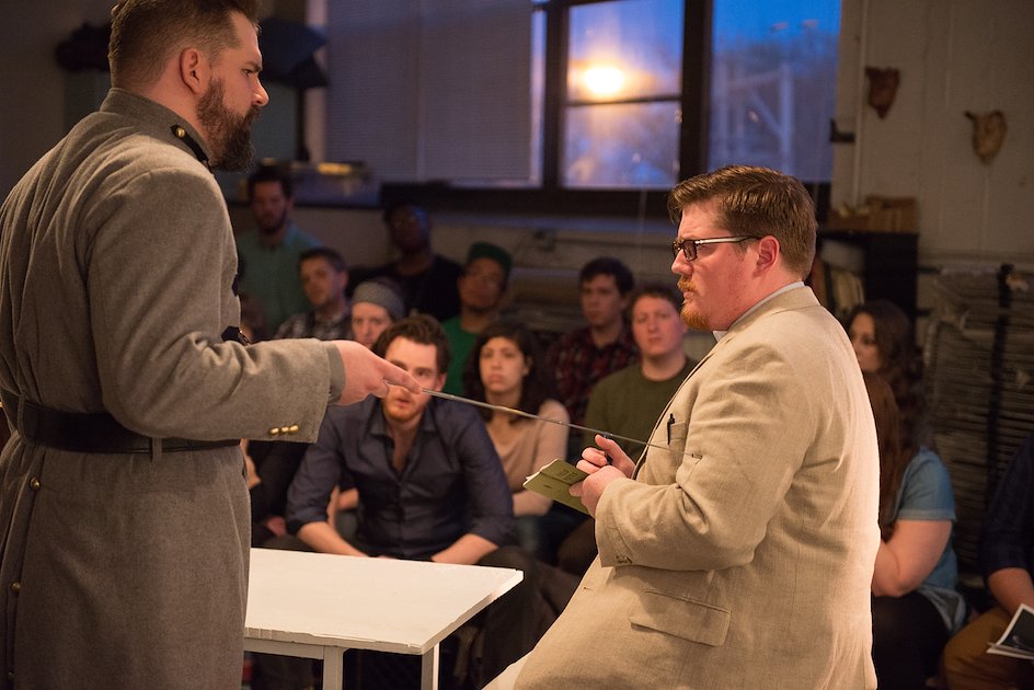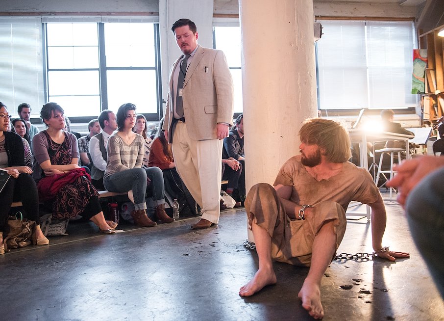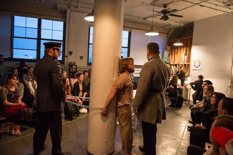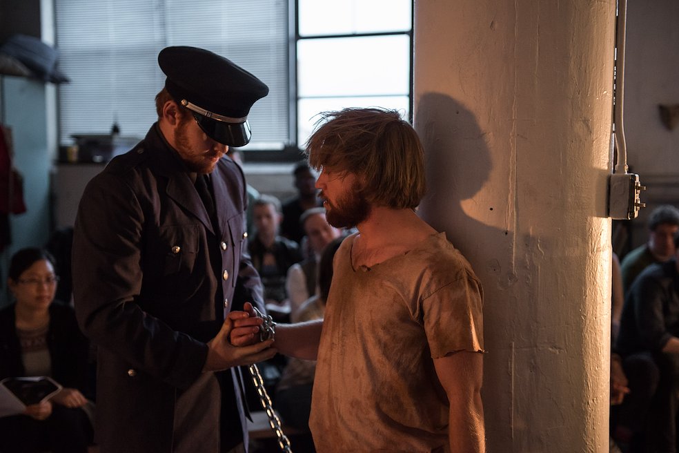 The Soldier (Eric Staves) shackles the Condemned Man (Matt Katzenmeier) to a column.