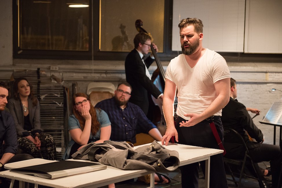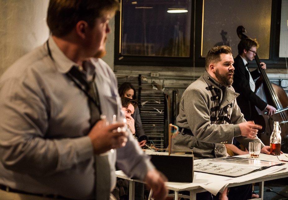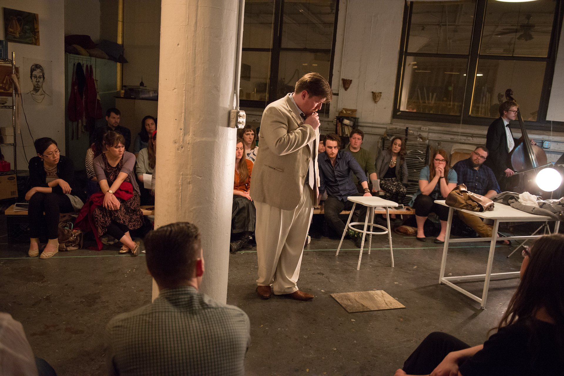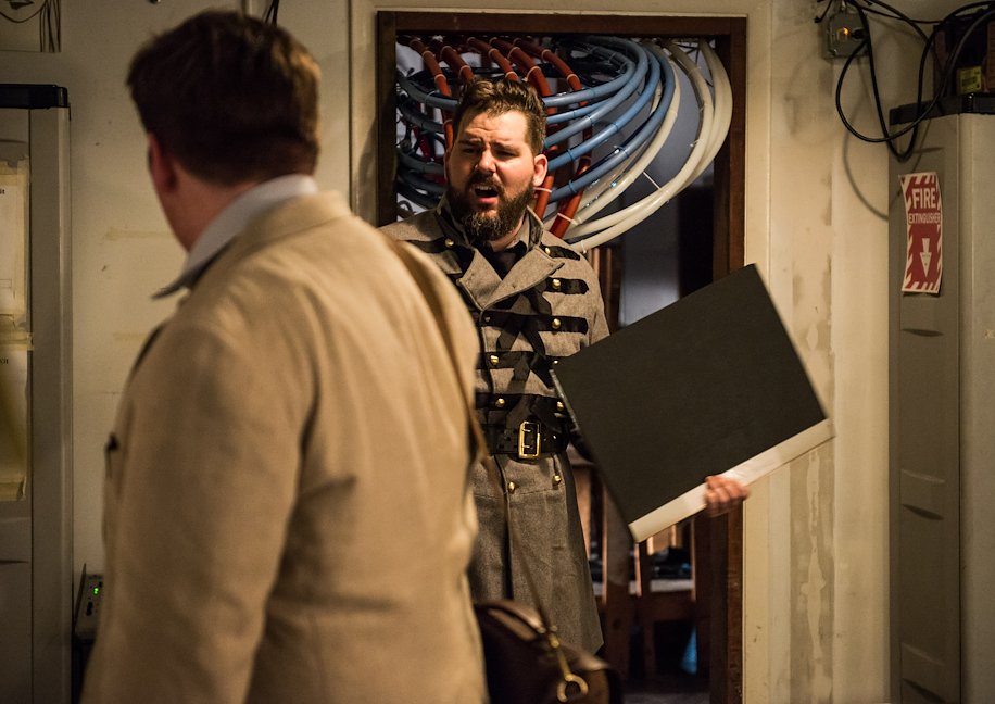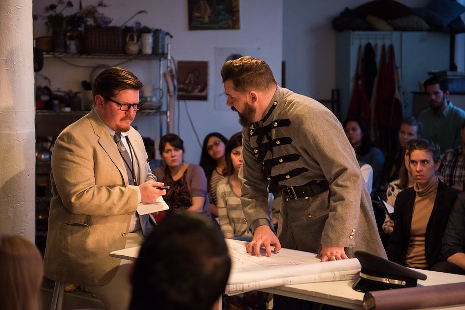 The Soldier (Eric Staves) shackles the Condemned Man (Matt Katzenmeier) to a column.
