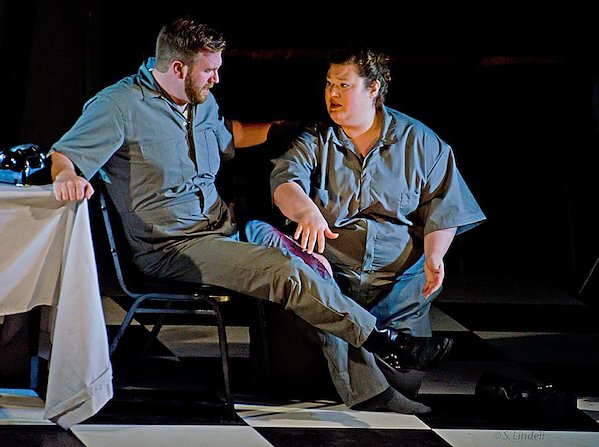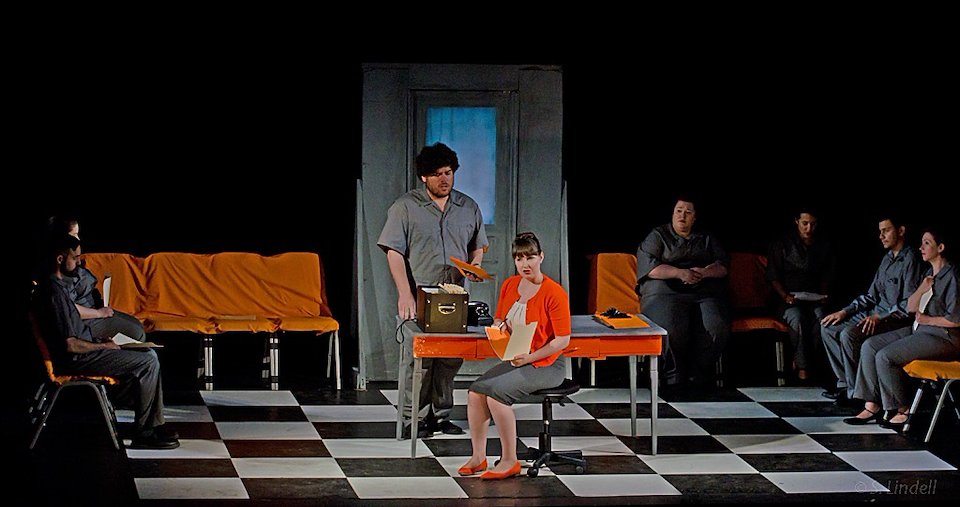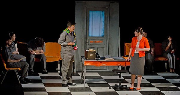 In the Consulate, Mr. Kofner (Daniel Johnson) appeals to the Secretary (Julia Hardin) for a visa, but to no avail.